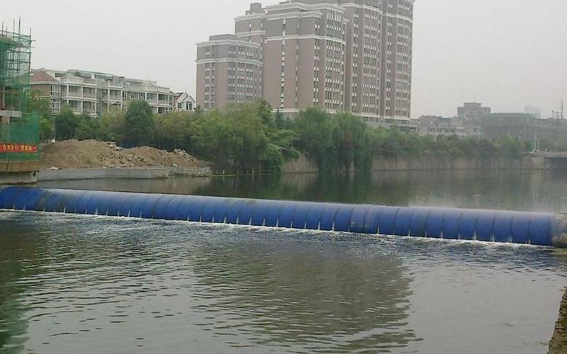 充氣橡膠壩,是用高強度合成纖維織物做受力骨架,內外涂敷橡膠作保護層,加工成膠布,再將其錨固于底板上成封閉狀的壩袋,通過充排管路用水(氣)將其充脹形成的袋式擋水壩。壩頂可以溢流,并可根據需要調節壩高,控制上游水位,以發揮灌溉、發電、航運、防洪、擋潮等效益。